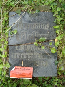 Verstorben in Folge des Krieges. Grab des Soldaten; Steinplatte zerbrochen und umgestürzt.
