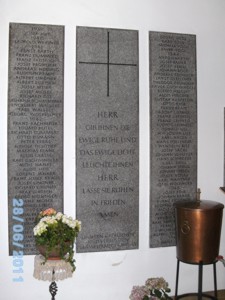 Drei Steintafeln in der Pfarrkirche mit Inschrift und den Namen der Opfer des 2. Weltkrieges.