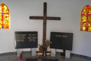 Weiße verputzte Wand beim Aufgang zum Friedhof mit überdachtem Holzkreuz und E.K., sowie zwei Natursteinplatten mit Inschriften und Namen der Gefallenen.