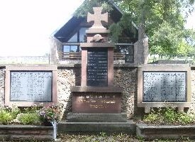 Vor dem Friedhof befindet sich das Kriegerdenkmal. In der Mitte, aus Sandstein ein dreiteiliger Gedenkstein, in der Mitte eine Namenstafel aus Marmor. Als Abschluß ein deutsches Kreuz, darunter ein Stahlhelm mit Lorbeerästen. Links und rechts daneben, an die Friedhofsmauer angefügt, zwei Namenstafeln aus Marmor.