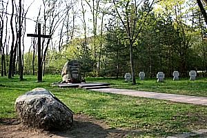 Gedenkstätte für die Toten des Internierungslagers Nr. 5. Das Lager wurde Ende April 1945 im seit 1942 bestehenden Außenlager des KZ Sachsenhausen eingerichtet und bestand bis Februar 1947. Unter den Gefangenen waren neben Deutschen (u.a. zahlreiche Angehörige der Organisation Werwolf - SS-Leute, Hitlerjungen, SA-Männer und Parteifunktionäre) auch etwa 2000 Soldaten der Wlassow-Armee (sog. Russische Befreiungsarmee) und der Ostlegion (nichtrussische Armeeverbände) die auf deutscher Seite kämpften. Das Lager wurde 1947 aufgelöst und die Gefangenen auf andere Lager (die bis 1950 bestanden, erste Entlassungen erfolgten 1948) aufgeteilt. Die hier Verstorbenen sind 1952/53 auf den Waldfriedhof Halbe umgebettet worden.