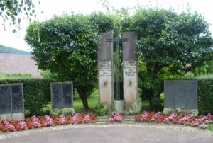 Denkmal auf dem Friedhof in Gingen. Zwei Steinsäulen, dazwischen ein aufrecht stehendes Metallkreuz. Rechts zwei Tafeln mit den Namen der Toten des 1. Weltkrieges, links drei Tafeln mit den Namen der Toten des zweiten Weltkrieges (nicht aufgenommen).