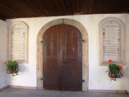 Zwei gerahmte Natursteintafeln auf beiden Seiten vom Kircheneingang der Kirche von Gödersdorf mit