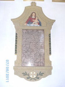 Verzierter Bildstock in der Ortskirche (Expositurkirche) mit Inschrift und den Namen der Opfer des 1. Weltkrieges
