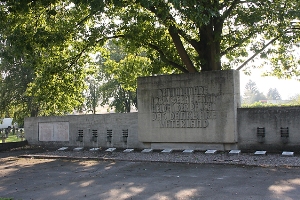 im Zentralfriedhof; Gedenkwand mit Inschrift und Gedenktafel, davor am Boden eine Reihe weisser Steine mit Namen