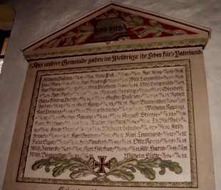 Die Gedenktafeln für die Gefallenen des 1. Und 2. Weltkriegs enthalten die gleichen Namen und Informationen wie das Denkmal. Zusätzliche Informationen in Blau vom Volksbund für Kriegsgräberfürsorge: www.volksbund.de In dem Soldatengrab sind weitere 4 unbekannte Soldaten bestattet, gefallen am 02.05.1945.