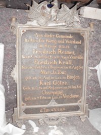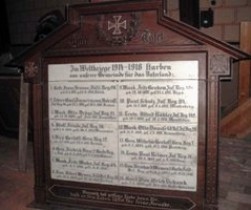 Tafel 1. Weltkrieg: Ehren Tafel. Im Weltkriege 1914-1918 starben aus unserer Gemeinde für das Vaterland: (Namen).
