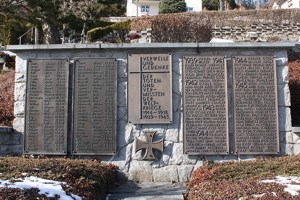 im Friedhof; gemauerte Wand mit Gedenktafeln; zusätzlich Hinweise zu Soldaten von privaten Gedenksteinen