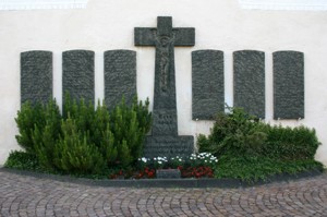 Aussen an der Kirche; in der Mitte Steinkreuz, flankiert von je 3 Marmortafeln; zusätzlich Hinweise zu Soldaten von privaten Gedenksteinen