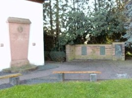 An der evangelischen Kirche/Laurentiuskapelle ist an der Außenwand ein Gedenkstein aus Sandstein angebracht. Rechts neben der Kapelle Eine sandsteinverkleidete Wand, an der zwei Namenstafeln aus Metall, sowie ein Bild einer trauernden Frau angebracht sind.