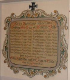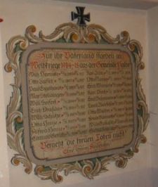 Für den Ersten Weltkrieg zwei Tafeln im Vorraum der Kirche, für den Zweiten Weltkrieg ein Kreuz mit