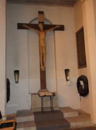 Christus-Figur und zwei allgemeinen Tafeln in einer Nische links vom Altar.