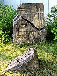 Denkmalfragment vor der Kirche . Das eigentliche Denkmal wurde am 24.Juli 1921 eingeweiht. Aus Resten desselben wurde das jetzige im Jahre 1997 aufgestellt. Die Namen der Gefallenen stammen aus dem Gemeindeblatt von 1921