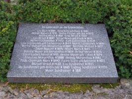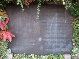 Bronzetafel: (Bild der Synagoge) „Ich beweine Tag und Nacht die Erschlagenen der Tochter meines Volkes.“ Jeremia 8:23 Zur Erinnerung an die Heppenheimer Synagoge. Sie stand inmitten des Gartens oberhalb der Mauer. Gestiftet 1897 von den nach London ausgewanderten Söhnen des Baruch Hirsch, Vorstehers der Jüdischen Gemeinde. Entworfen von Prof. Heinrich Metzendorf. Eingeweiht am 10. Oktober 1900. Zerstört am 10. November 1938 nach der Progromnacht. Am 30. Januar 1933 zählte die Jüdische Gemeinde 113 Mitglieder. 24 Juden sind Opfer der Gewaltherrschaft des Nationalsozialismus geworden. Die Überlebenden sind in alle Welt zerstreut. Die Bürger der Stadt Heppenheim 10. November 1988 Steintafel: Im Gedenken an die Ermordeten (Namen)
