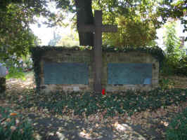 Zwei an einer freistehenden Mauer angebrachte Metalltafeln auf dem Hochdorfer Friedhof, davor aufrecht stehendes Holzkreuz.