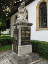 Vor der Kirche steht das Denkmal. Der Grundriß ist quadratisch und an drei Seiten sind Marmortafeln mit den