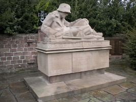und Hauptstraße: Sandsteinskulptur eines auf den Unterarm gestützt liegenden Soldaten auf