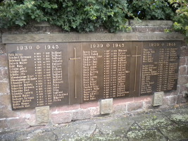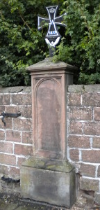 Landkreises Südwestpfalz enthalten), dahinter in eine Mauer eingemauert eine Gedenktafel mit Kreuz für