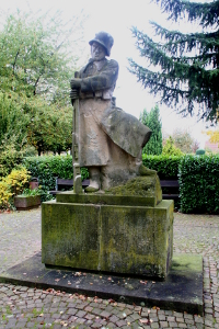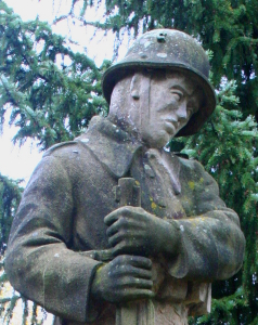 zwischen Trauerhalle und Friedhofseingang: Sandsteinskulptur eines stehenden Soldaten mit Mantel, Helm und