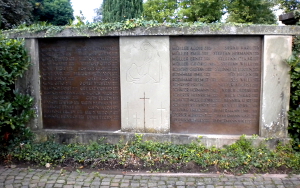 Daneben in der Friedhofsmauer eingelassen zwei Bronzetafeln mit den Opfern des 2. Weltkriegs.