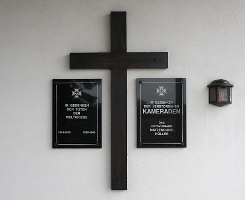 Hölles (Friedhof), Gemeinde Matzendorf-Hölles, Bezirk Wr. Neustadt Land, Niederösterreich, ÖsterreichPLZ 2751 Im Friedhof; zwei Gedenktafeln an der Abdankungshalle, dazwischen Holzkreuz