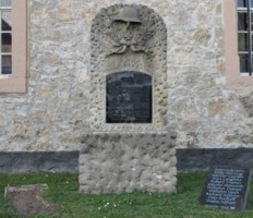 Direkt vor der Kirche ist das Denkmal zu finden. Die Namen für den 1. Weltkrieg findet man auf einer schwarzen Marmortafel, die in eine Betonplatte eingelassen ist. Oberhalb der Marmorplatte ist eine Zier aus Eichenkranz mit Schleife und Stahlhelm mit eisernem Kreuz zu sehen.