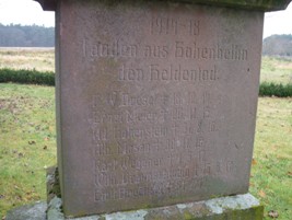 Denkmal: 1914-1918 fanden aus Hohenbellin den Heldentod (Namen) Treue um Treue Gedenkgrab: Dem Gedächtnis unseres bei Naulila in SW Afrika gefallenen Sohnes F.W. Dresel, Geboren 14. Dez. 1881, Gefallen 18. Dez. 1914 Soldatengrab: Ruhestätte 12 Unbekannter Soldaten