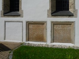 Zwei in die Außenmauer der Honauer Kirche eingelassene Steintafeln.