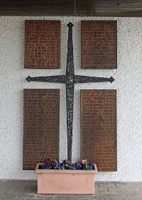 Im Friedhof; Gedenktafeln an der Abdankungshalle, dazwischen ein Kreuz; zusätzlich Hinweise zu Soldaten von privaten Gedenksteinen