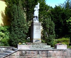 Ehrenmal in Hanglage an einer Straßenkreuzung in Ortsmitte. Über gestuftem Sockel ein vierseitiger