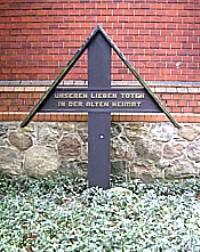 Gedenkkreuz an der Kirchenmauer für die Vertriebenen.Jütrichau hatte im 1. Weltkrieg sechs Gefallene zu beklagen. Im 2. Weltkrieg fielen 22 Einwohner des Ortes