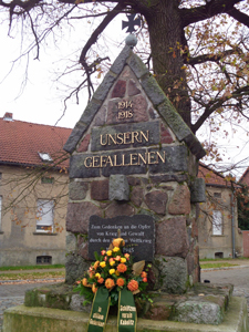 Neues Denkmal aus gemauerten Feldsteinen mit allgemeinen Tafeln für die Opfer des 1. und 2. Weltkriegs. Auf der Rückseite ist ein großer Feldstein eingemauert mit den Namen der Gefallenen des 1. Weltkriegs (schlecht lesbar, vom alten Denkmal).