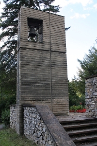gegenüber ein Glockenturm mit Inschrift; zusätzlich Hinweise zu Soldaten von privaten