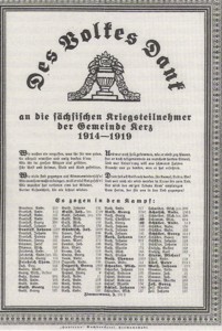 Des Volkes Dank An die sächsischen Kriegsteilnehmer der Gemeinde Kerz 1914-1918 Wir wollen nie vergessen, was ihr für uns getan, Es allezeit ermessen und ewig denken d’ran Wie ihr im großen Ringen viel gelitten Für Volk und Heimat, Weib und Kind gestritten.