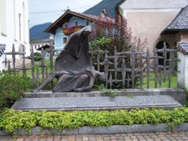 Denkmal neben der Kirche mit Figurengruppe und Kreuzen