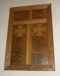 In der Kirche eine Holztafel mit den Namen der 23 Opfer des Zweiten Weltkrieges.