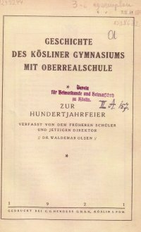 Gedenkschrift „Geschichte des Kösliner Gymansiums mit Oberrealschule zur Hundertjahrfeier“, verfasst von dem früheren Schüler und jetzigen Direktor Dr. Waldemar Olsen, 1921