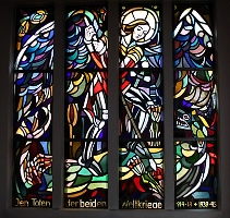 In der Laurentius Kirche; Inschriften an einem Kirchenfenster