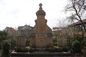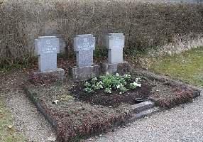 Bei der Kirche ein Denkmal mit seitlich zwei Gedenktafeln – Im Friedhof; drei Soldatengräber nebeneinander