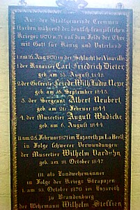 Aus der Stadtgemeinde Cremmen starben während des deutsch-französischen Krieges 1870 u. 71 auf dem Felde der Ehre mit Gott für König und Vaterland