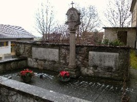 Vor der Kirche das Kriegerdenkmal. In der Mitte steht ein Bildstock, rechts und links daneben sind an einer Wand Namenstafeln aus Stein angebracht.