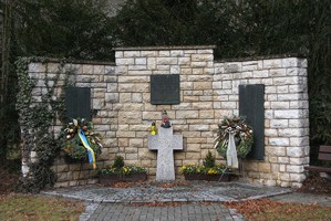 im Friedhof; gemauerte Wand mit Gedenktafeln, davor Steinkreuz; zusätzlich Hinweise zu Soldaten von privaten Gedenksteinen