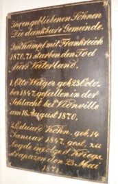 Gedenktafeln in der Kirche – Gedenkstein auf dem Friedhof Im Ort wurde ein Denkmal zwischen zwei Eichen errichtet mit den Inschriften „1864 Friedenseiche“ und „1870/71 Friedenseiche“. Es besteht aus einem Sockel mit aufgerichteter alter Grabplatte die einen Ritter in Rüstung abbildet (ohne weitere Inschriften).