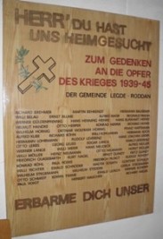 Tafel 1815: In dem blutigen, aber für Deutschland ruhmvollen Kriege gegen Frankreich 1813-1815 für des Vaterlandes Freiheit blieben: (Namen) Tafel 1870/71: Ihren gebliebenen Söhnen. Die dankbare Gemeinde. Im Kampf mit Frankreich 1870/71 starben den Tod fürs Vaterland. Tafel 1. Weltkrieg: 1914-19 Im Kampfe fürs Vaterland fielen aus der Gemeinde Legde Tafel 2. Weltkrieg: Zum Gedenken an die Opfer des Krieges 1939-45. Die Gemeinde Legde-Roddan. Herr du hast uns heimgesucht. Erbarme dich unser.