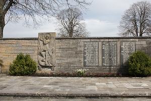 Im Friedhof; an der Friedhofsmauer Gedenktafeln und ein Bildrelief „Ritter und Drache“