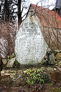 Leizen, Landkreis Mecklenburgische Seenplatte, Mecklenburg-VorpommernPLZ 17209 Natursteindenkmal bei der Kirche. Die Namen und Daten sind allerdings nicht mehr infolge Verwitterung zu lesen. Auf dem nahegelegenen Friedhof zwei Einzeldenkmale
