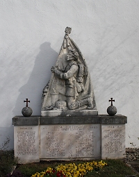 An der Kirche; Denkmal oben mit Steinplastik „knieender Soldat mit Fahne“; zusätzlich Hinweise zu Soldaten von privaten Gedenksteinen