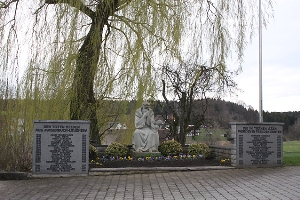Bei der Kirche; in der Mitte Steinplastik „sitzender Mann und Kind“, seitlich zwei Gedenktafeln