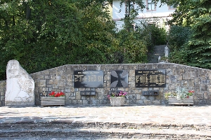 Am Dreifaltigkeitsplatz; Gedenktafeln an der Wand, seitlich davon Stein mit Relief; zusätzlich Hinweise zu Soldaten von privaten Gedenksteinen