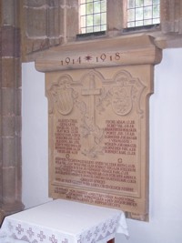Im Altarraum ist an der rechten Seitenwand eine Gedenktafel für die Gefallenen des 1. Weltkrieges angebracht. Die weiße Marmortafel enthält zur Verzierung links und rechts ein Rauten- und Löwenwappen und in der Mitte ein Schwert mit Lorbeerzweigen. Die Namen der Gefallenen und Vermissten sind in rot unterlegter Schrift eingemeißelt.